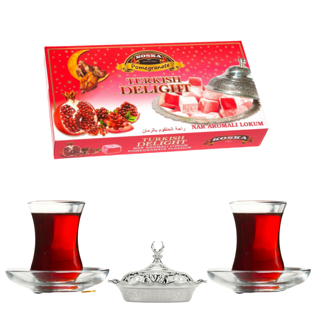 Este pack degustación combina la elegancia de las tazas tradicionales con la dulzura inconfundible de las delicias Koska, elaboradas en Estambul con auténticas recetas otomanas.