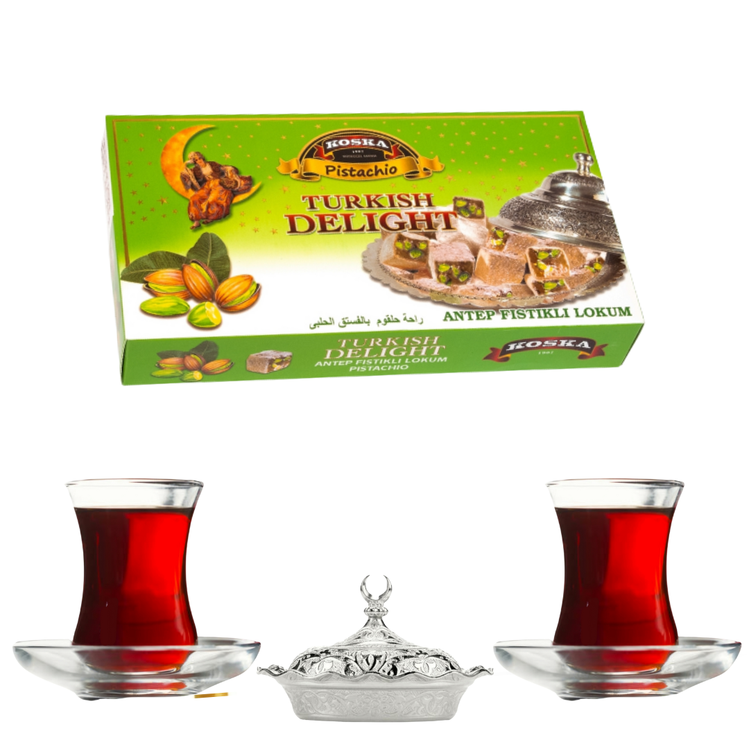 Este pack degustación combina la elegancia de las tazas tradicionales con la dulzura inconfundible de las delicias Koska, elaboradas en Estambul con auténticas recetas otomanas.