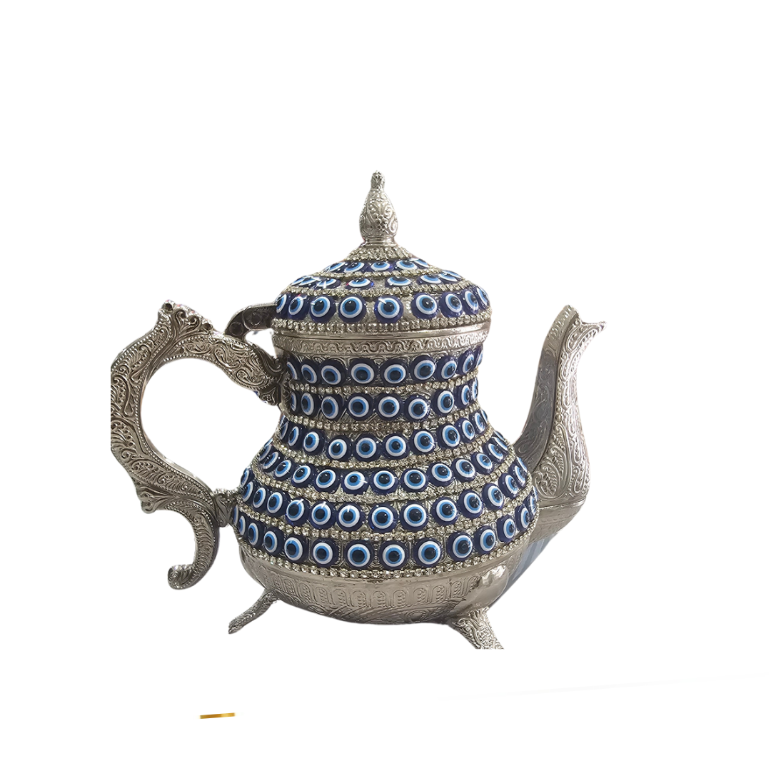 Esta tetera presenta un diseño elegante con detalles plateado con, rodeada de ojos turcos que evocan el arte tradicional turco, lo cual agrega un toque visual atractivo mientras mantiene el encanto clásico de los elementos decorativos. Los acabados en la tapa y el asa con ornamentos elaborados le dan un aspecto majestuoso, ideal para una presentación especial.